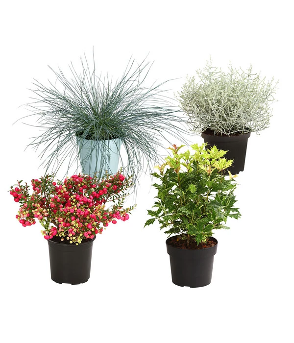 Dass aparte Gewächse, die uns mit Blattschmuck begeistern, spät im Jahr blühen und mit dem Anblick farbenfroher Beeren verwöhnen, kaum Pflege brauchen, ist erstaunlich. Das Grabpflanzenset Lichtblick beweist genau das. Alle enthaltenen Pflanzen sind immergrün und winterhart. Ein idealer Herbst- und Winterschmuck, der kaum Ansprüche an den Standort oder den Boden stellt. Allerdings sollte er durchlässig sein, um Staunässe zu vermeiden und der Torfmyrte geben Sie beim Einsetzen am besten etwas Rhododendronerde mit ins Pflanzloch.