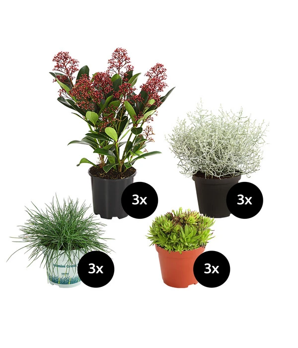 Mit dem Grabpflanzenset Würdevoll wird sich die Grabstätte bis weit in den Winter im Schmuck unterschiedlicher Farbtöne präsentieren. Denn alle im Set enthaltenen Pflanzen sind wintergrün, aber die Blütenskimmie ‚Rubella‘ trägt lange ihre zierenden, dunkelrote Blütenrispen und das Gitterkraut steuert elegante Silbertöne bei. Alle Pflanzen wünschen sich einen durchlässigen Boden, die Skimmie schätzt zusätzlich etwas Rhododendronerde an ihren Wurzeln, darüber hinaus aber brauchen die robusten Pflanzen kaum Pflege. Deshalb können sicher sein können, dass die letzte Ruhestätte Ihrer Lieben mit dem Grabpflanzenset Würdevoll lange dekorativ und gepflegt aussieht.