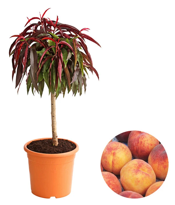 Wer im Mittelmeerraum schon an großen Pfirsichplantagen vorbeigefahren ist oder einige prächtige Exemplare in privaten Gärten bewundern durfte, wird dieses dekorative Stämmchen im ersten Moment gar nicht als Pfirsichbaum erkennen. Denn dieses Bäumchen präsentiert die typischen, lanzettähnlichen Blätter in einem wunderschönen Dunkelrot. Und doch handelt es sich bei diesem Mini-Baum um einen Pfirsich, genauer gesagt um einen rotlaubigen Zwergpfirsich. Mit seiner kompakten, runden Krone und seiner maximalen Wuchshöhe von nur maximal 100-150 cm ist die Pflanze ein exotisches Schmuckstück, das seinen Reiz optimal in kleinen Gärten, auf Terrassen und Balkonen entfalten kann. Das Bäumchen ist aber kein Blattschmuckgehölz, sondern ein echtes Obstgehölz. Im August schenkt der Zwergpfirsich von Dehner dem Gärtner mittelgroße Pfirsiche, die interessanterweise ebenfalls dunkelrot sind und ein herrlich saftiges, süßes Fruchtfleisch haben.